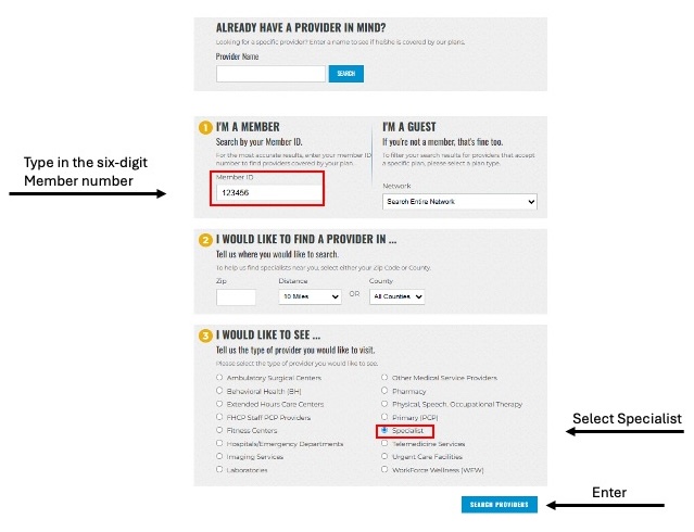 - When the six-digit member number is entered into the Member ID Field, the auto search will populate providers from closest to farthest within the member’s designated network by the member’s home zip code.